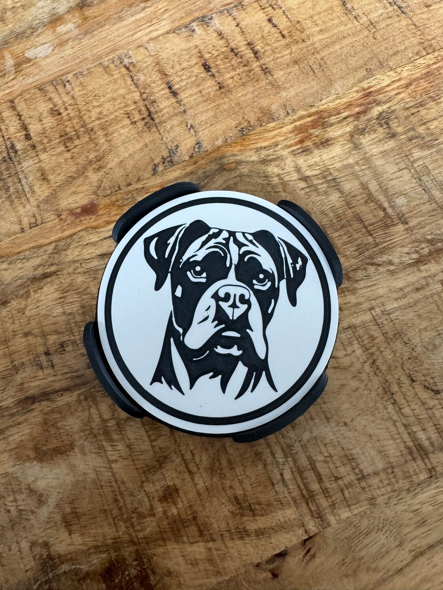 Boxers hebben een gezicht dat je meteen herkent — en dat zie je terug in deze onderzetters. De set bestaat uit 6 Boxer‑onderzetters, elk met dezelfde charmante boxer‑uitdrukking. De bijpassende houder maakt het geheel compleet: praktisch, netjes en een vrolijke toevoeging aan elke koffietafel.